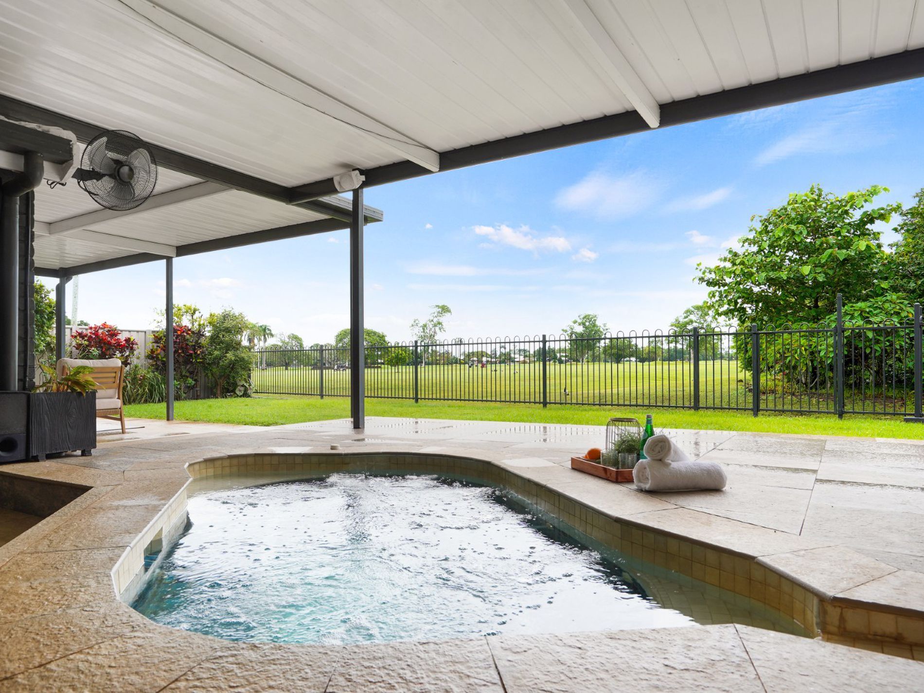 The sparkling spa and stone waterfall feature create a tranquil focal point, while reticulated gardens keep the surrounds lush year round. Beautiful native birds frequent the trees beyond, adding to the relaxed resort style atmosphere.